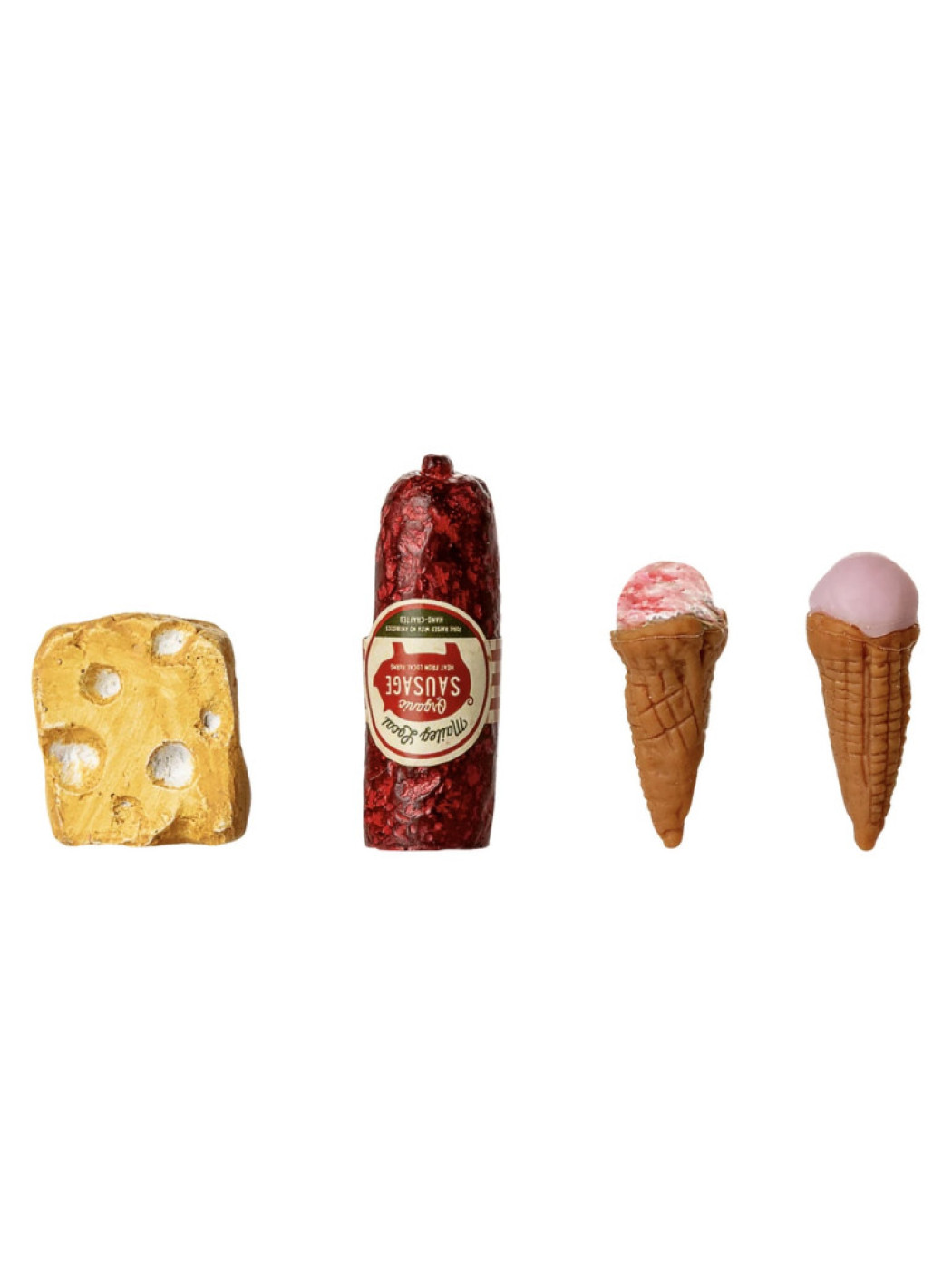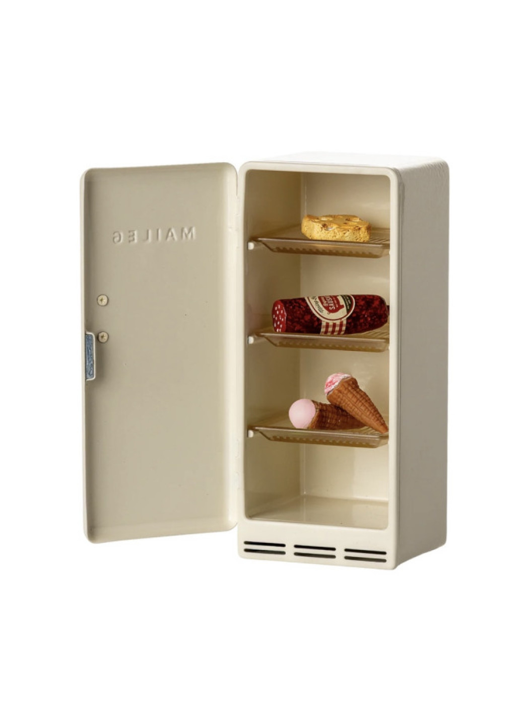 Un frigorífico antiguo que encaja perfectamente en la granja Maileg Mouse Hole Farmhouse. Dentro del frigorífico encontrarás un pequeño queso, salchichas y algunos helados. Contaremos más cuentos y alargamos el juego.