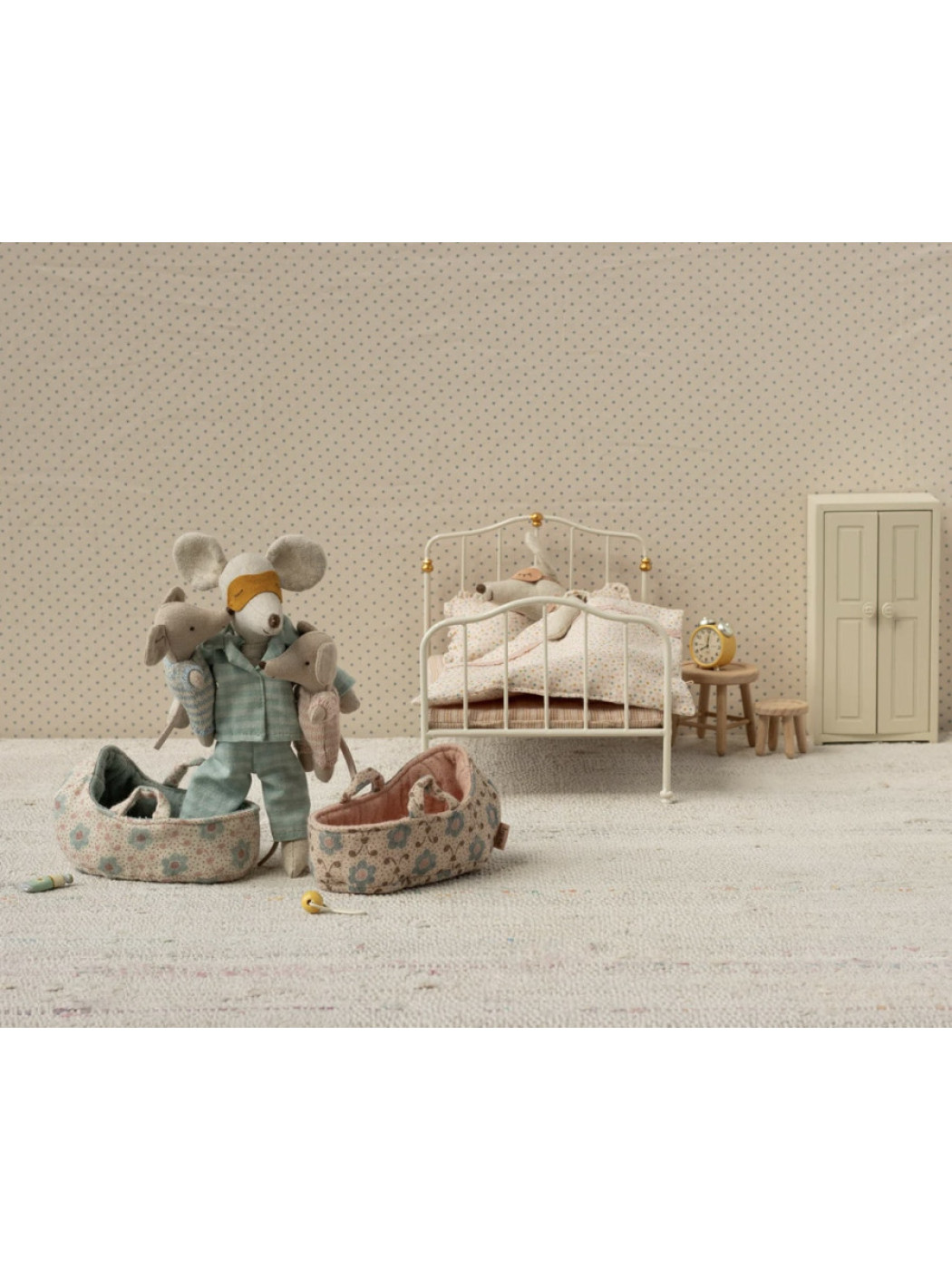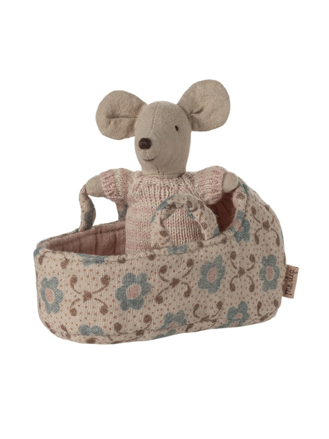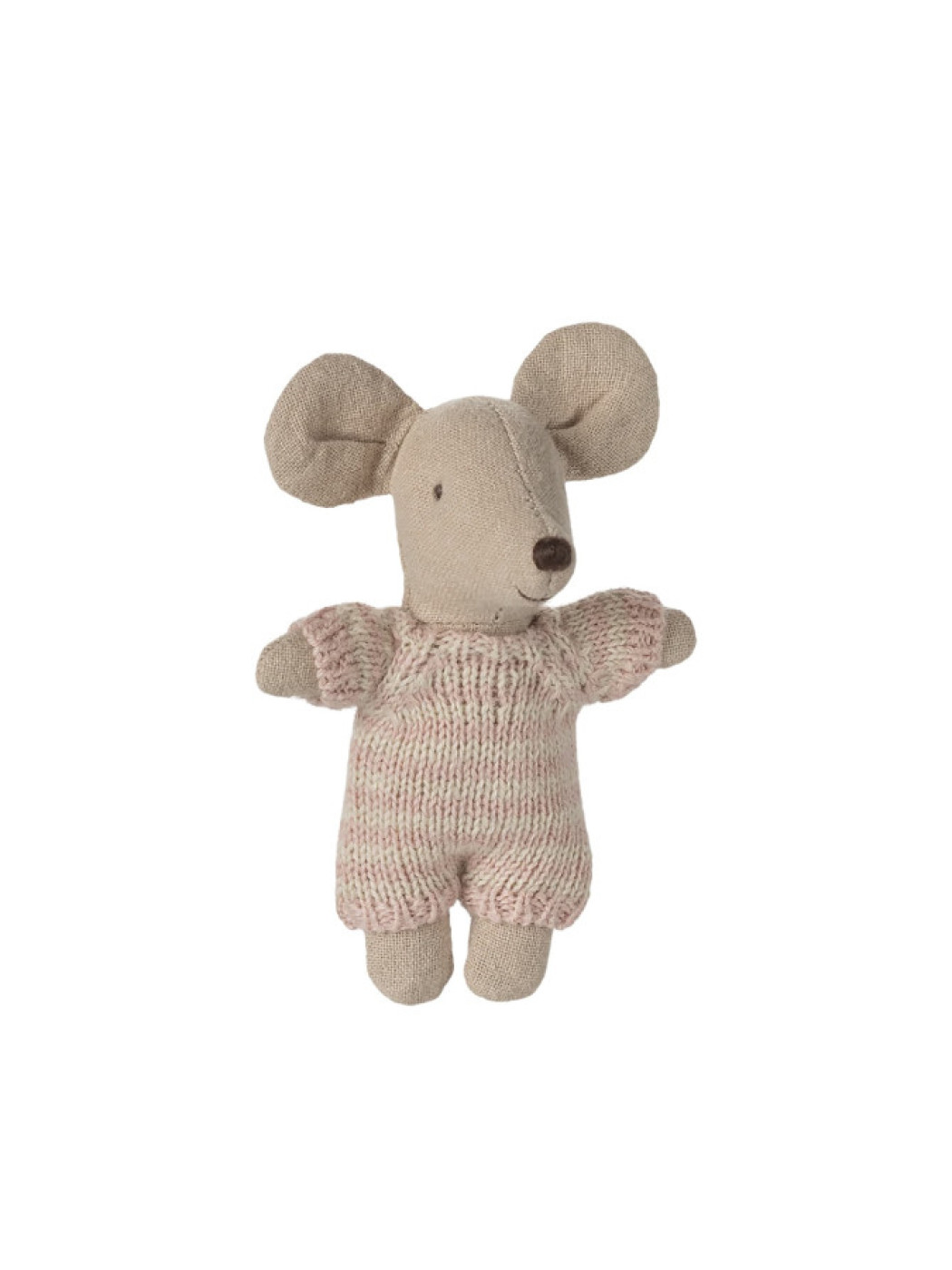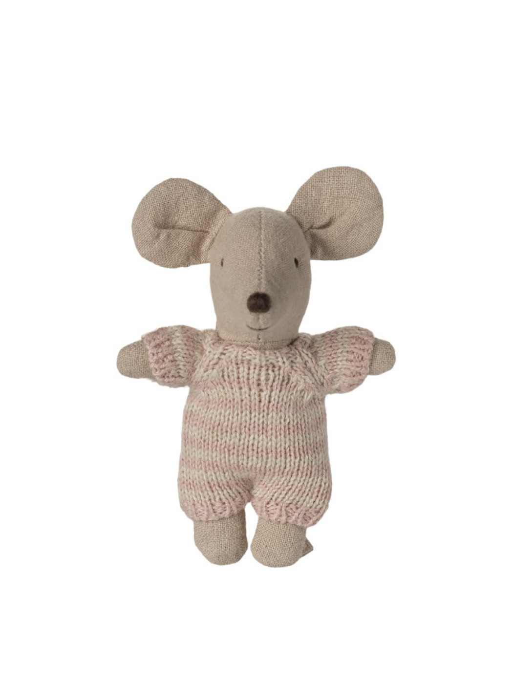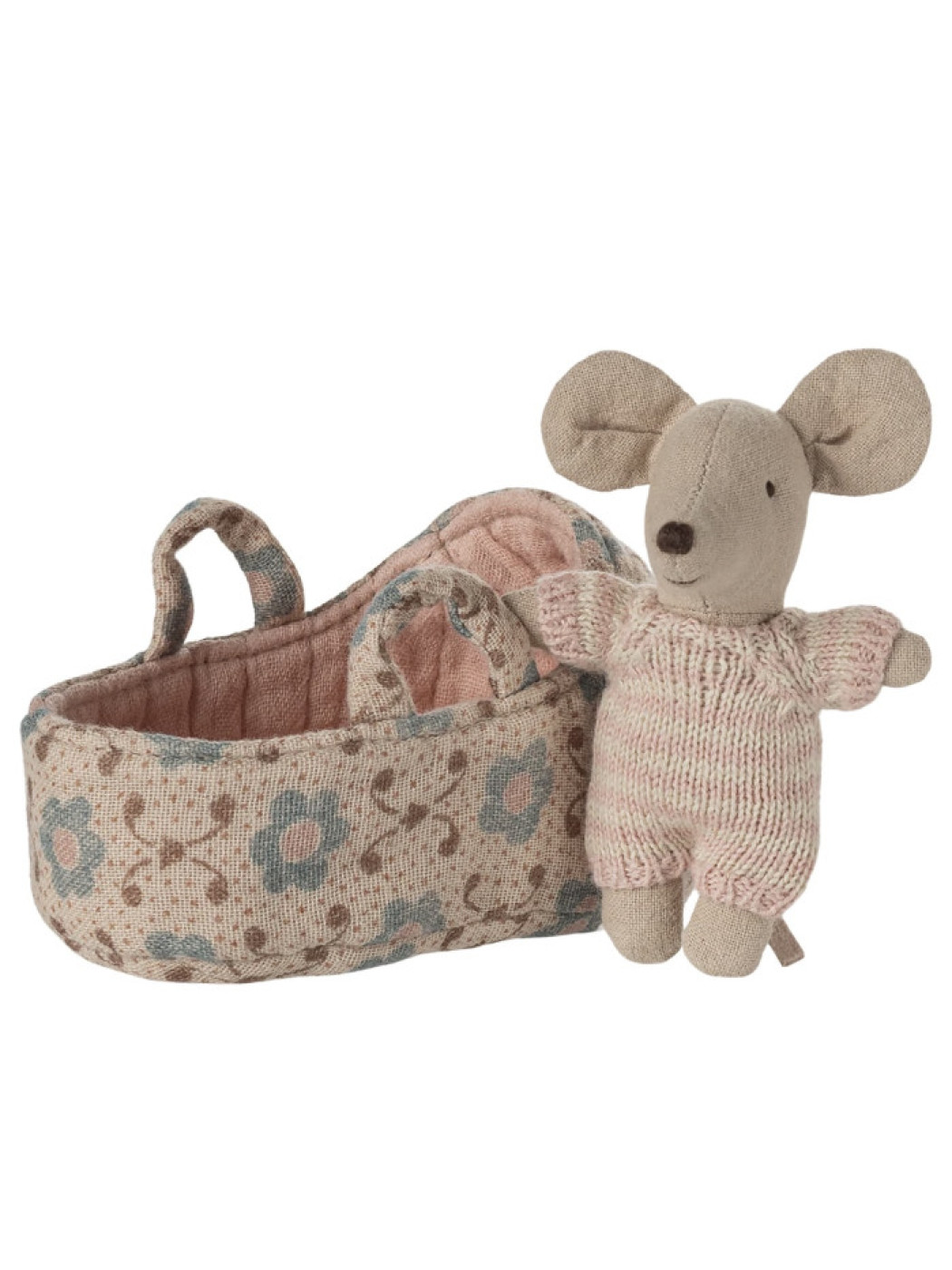Un pequeño bebé ratón en un traje de punto suave rayado. Duerme durante horas en su pequeño capazo acolchado.